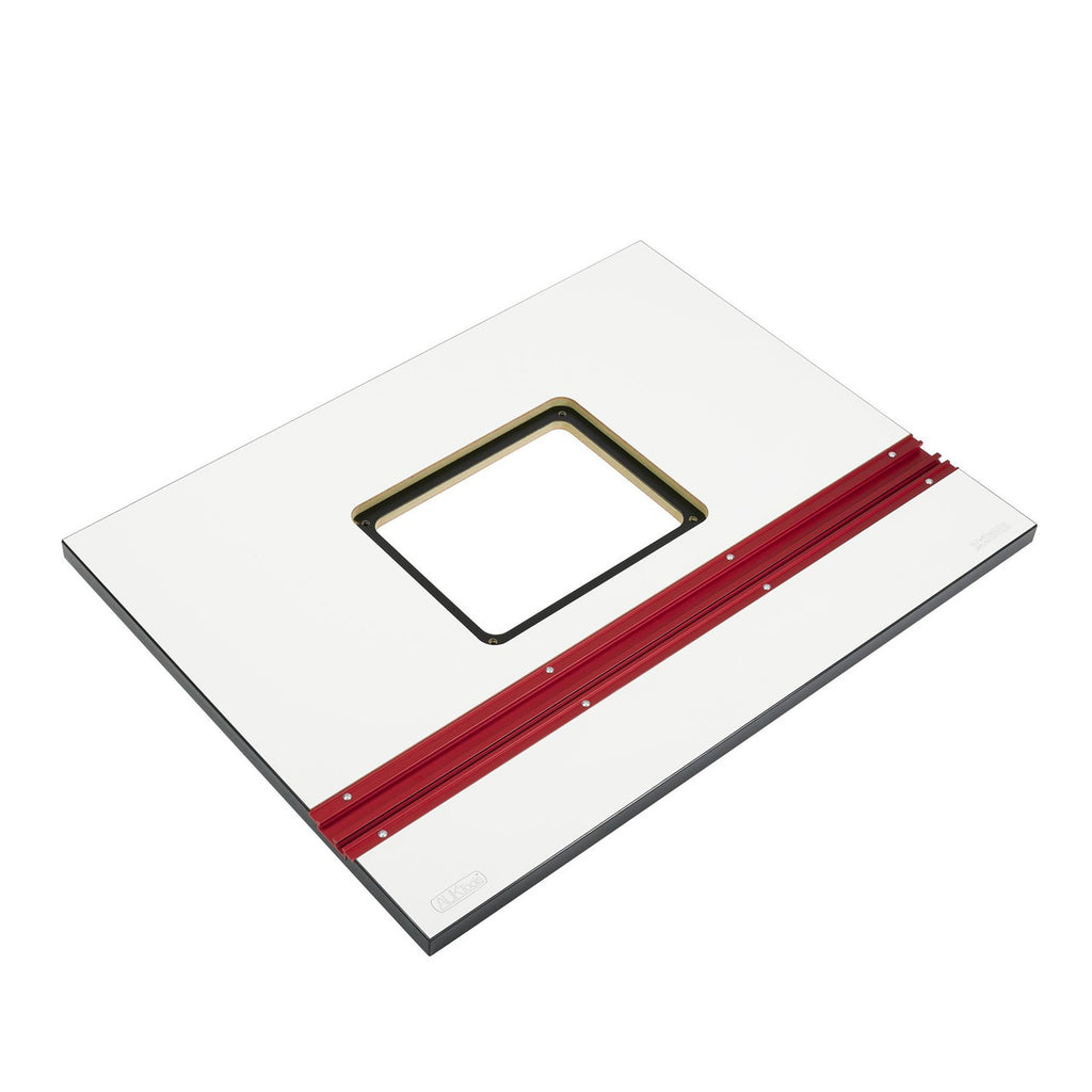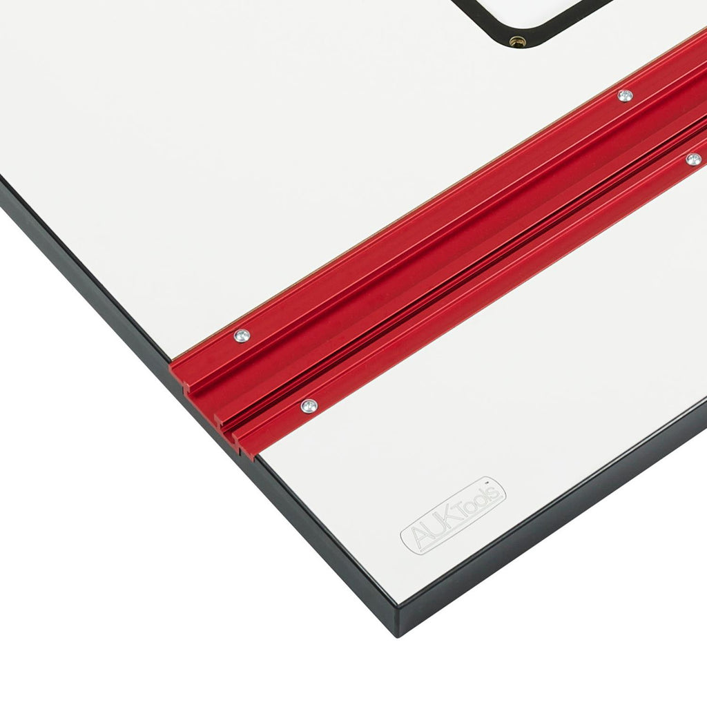 Our AUKTools Router Table Top is made with high-quality materials, including a HPL (High-Pressure Laminate) surface that offers low friction and durability. The table top is bonded to a green moisture-resistant MDF core, known for its stability in damp conditions. It features a dual-track system, compatible with both 1/4" t-slot and 3/4" mitre slot, making it versatile for various accessories like feather boards or a mitre gauge.