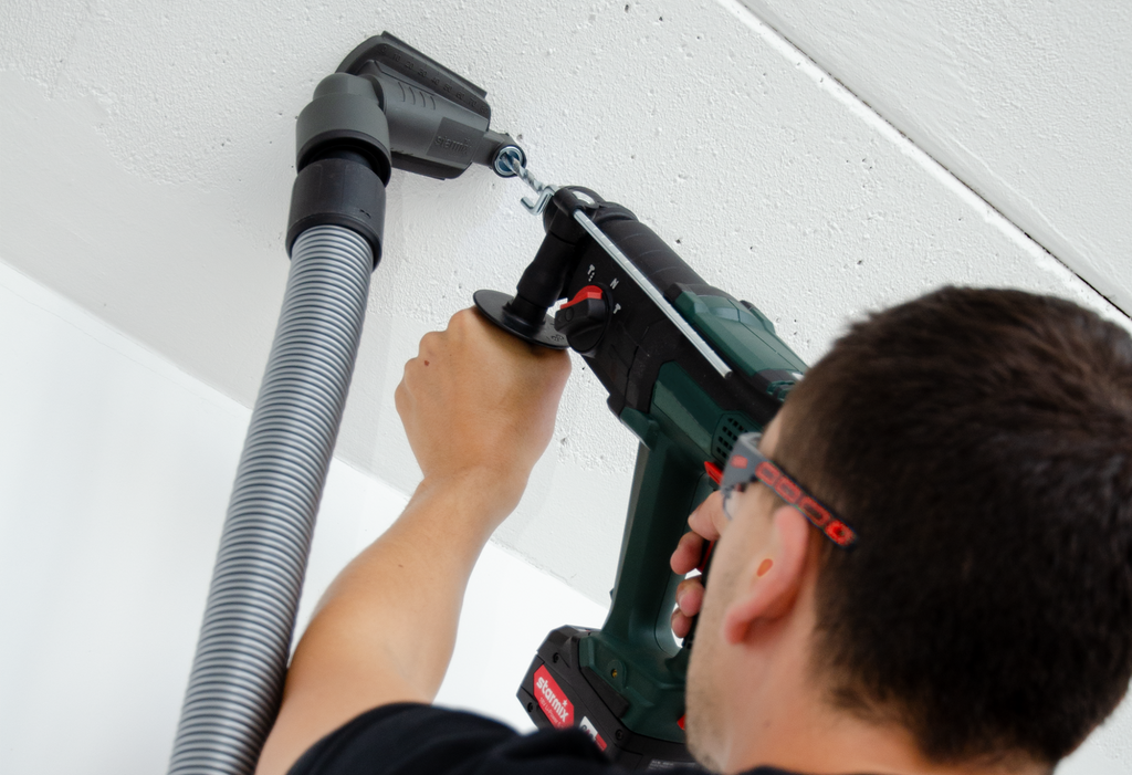 The Bohrfixx is an attachment designed for borehole suction, providing a patented solution for dust extraction directly at the drill hole. Compatible with all common household and industrial vacuum cleaners, this attachment makes dust-free drilling on walls and ceilings possible without additional help.