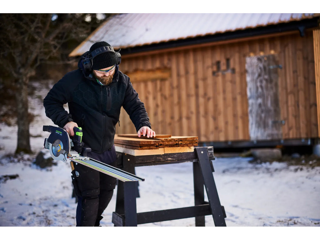 The Festool Cordless circular saw HKC 55 KEB-Basic offers power and flexibility for all your needs. With its brushless EC-TEC motor running at 5,200 rpm, it delivers speedy cross-cuts with the FSK cross-cutting guide rail, precise cuts with the guide rail FS, and accurate angled cuts. Key features include a clever KickbackStop, pendulum hood remote control, guide wedge, spring-assisted plunge-cut function, and specially designed thin-cut saw blades. It offers ultimate run time and top performance with the 18 V power, compatible with the 8.0 Ah Li-HighPower battery pack.