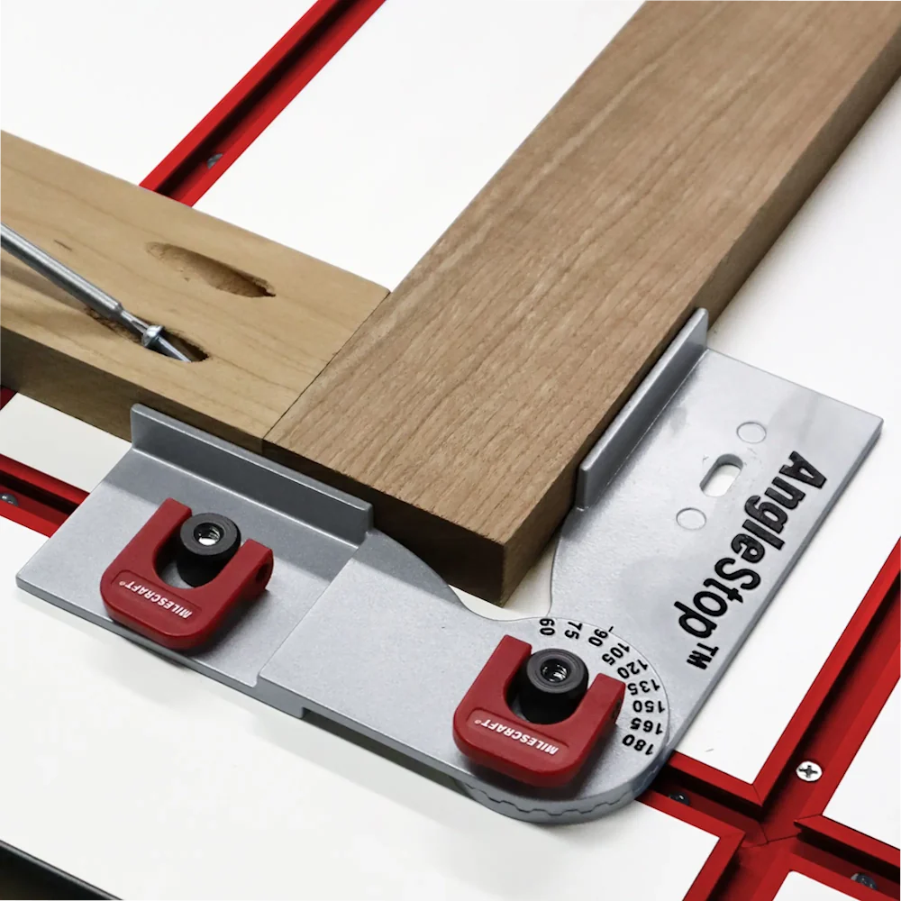 The AngleStop™ is a versatile T-Track stop engineered to support workpieces at almost any angle. With its adjustable range from 60° to 300°, it serves as either an inside or outside angle stop, adapting to the shape of your project. Its solid metal body ensures stability, while the cam-handle design makes repositioning fast and tool-free.